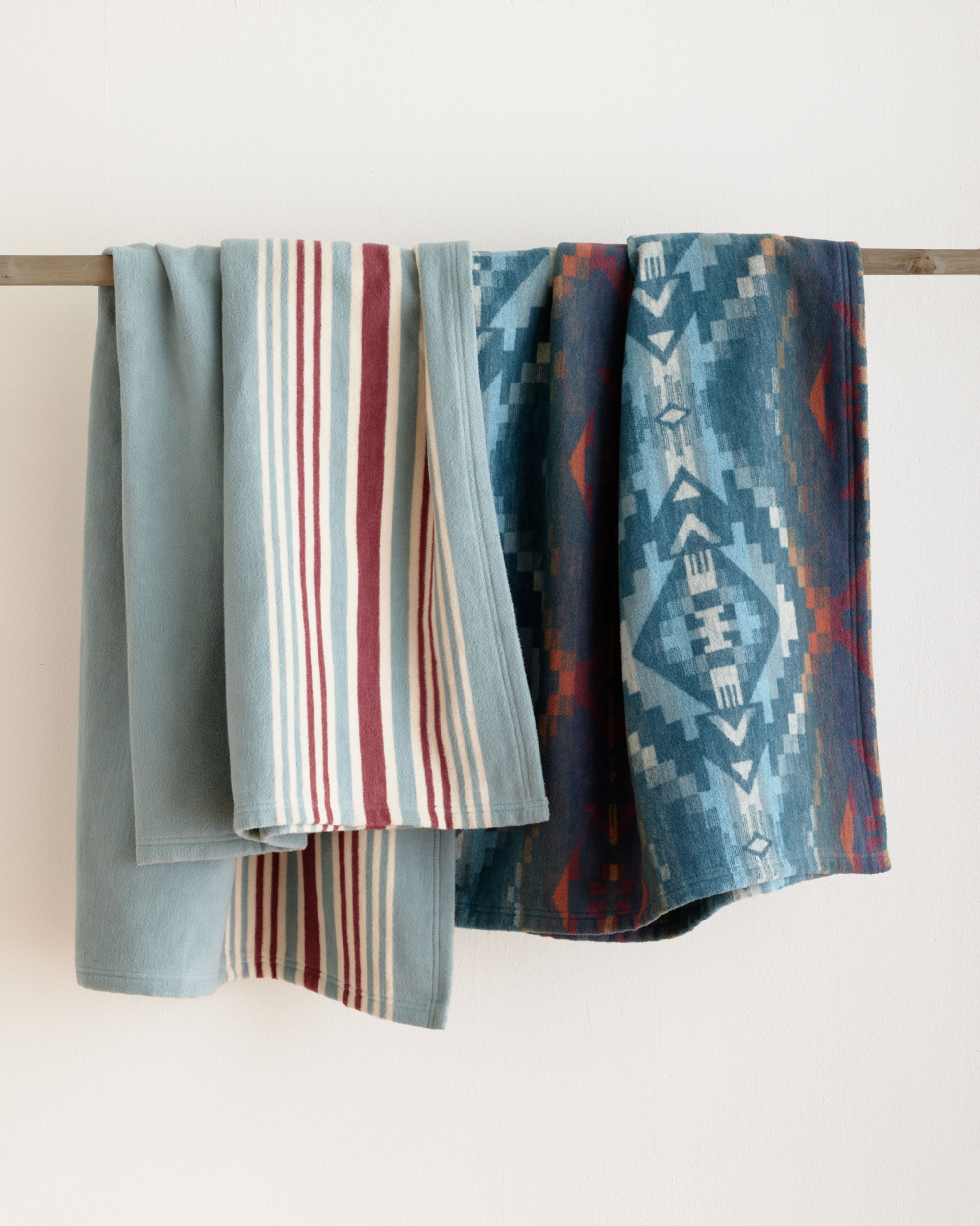 Ultra-soft cotton throws, perfectly packaged for gifting. Loomed just for us in Germany, with the same superb quality and attention to detail as our wool blankets. Sustainably made according to OEKO-TEK guidelines and GOTS certified. Set of two includes one patterned throw, one striped throw, in complementary colors that can be mixed and matched.