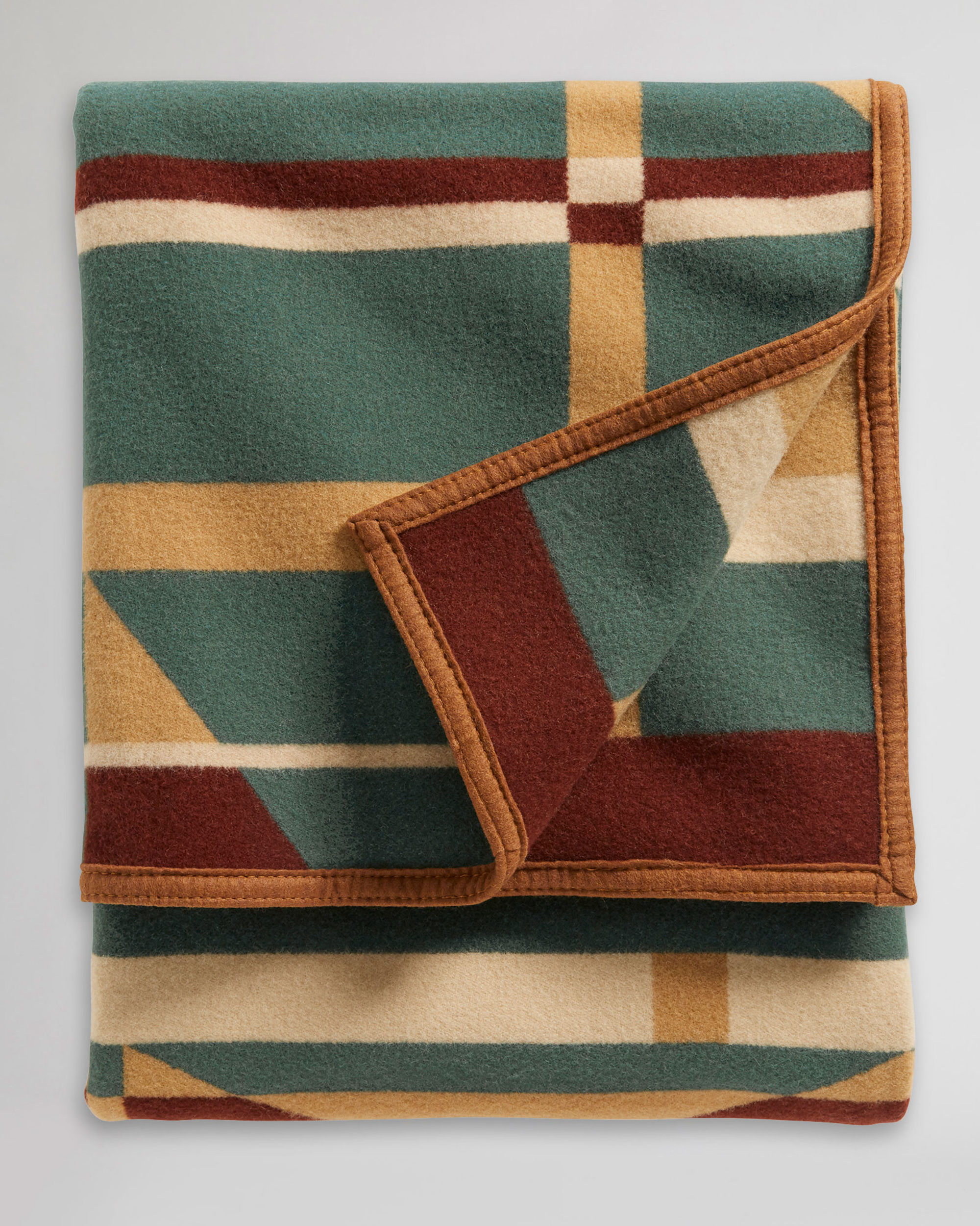 Created by Native American artist Ramona Sakiestewa, this USA-made wool blanket pays homage to the strength and utility of the cedar tree, considered by many tribes to be sacred. Bark and berries from can be used for medicine and food, with wood used for building and carving. This pattern embraces the colors of the tree, with an enclosing, protective diamond at the center.