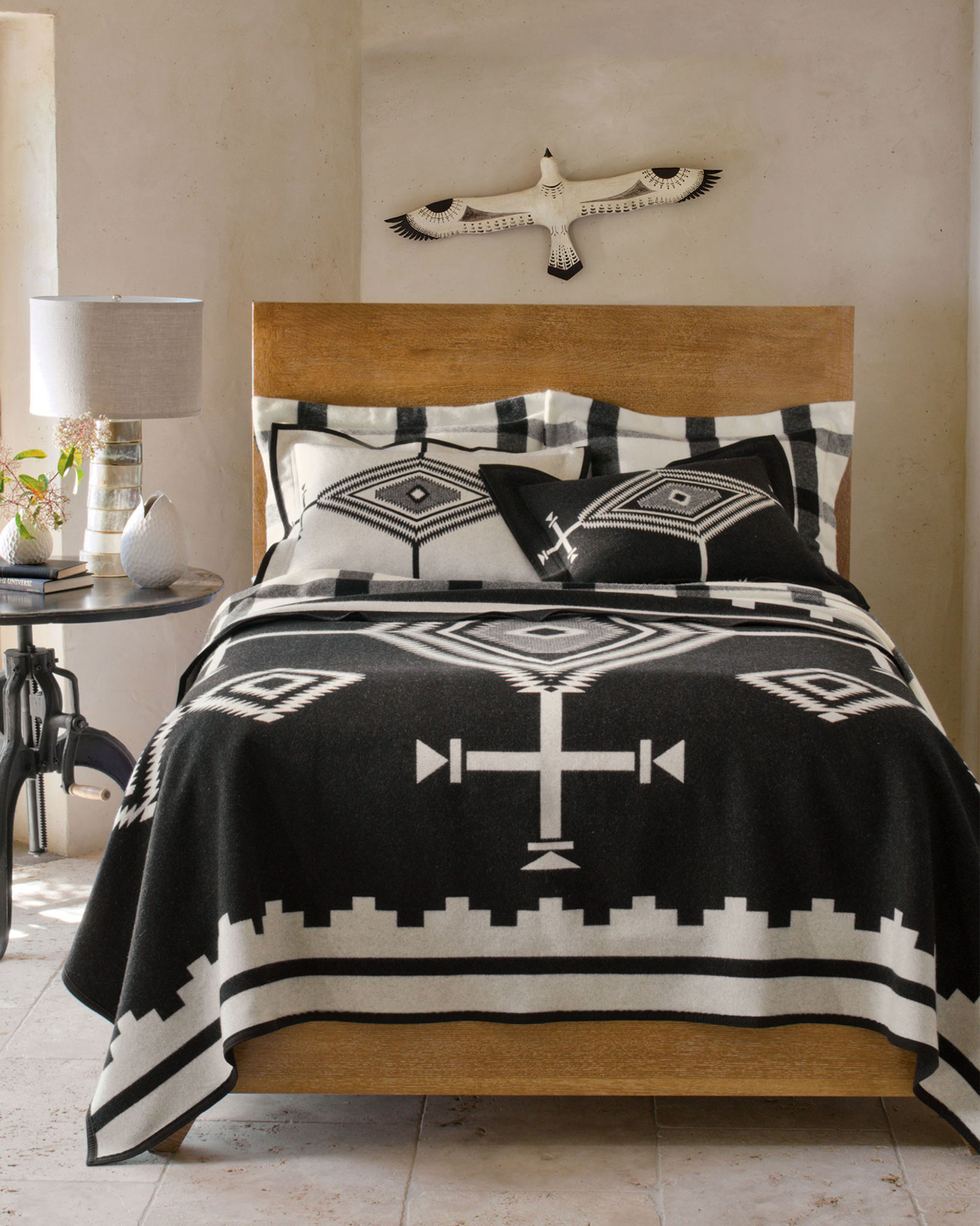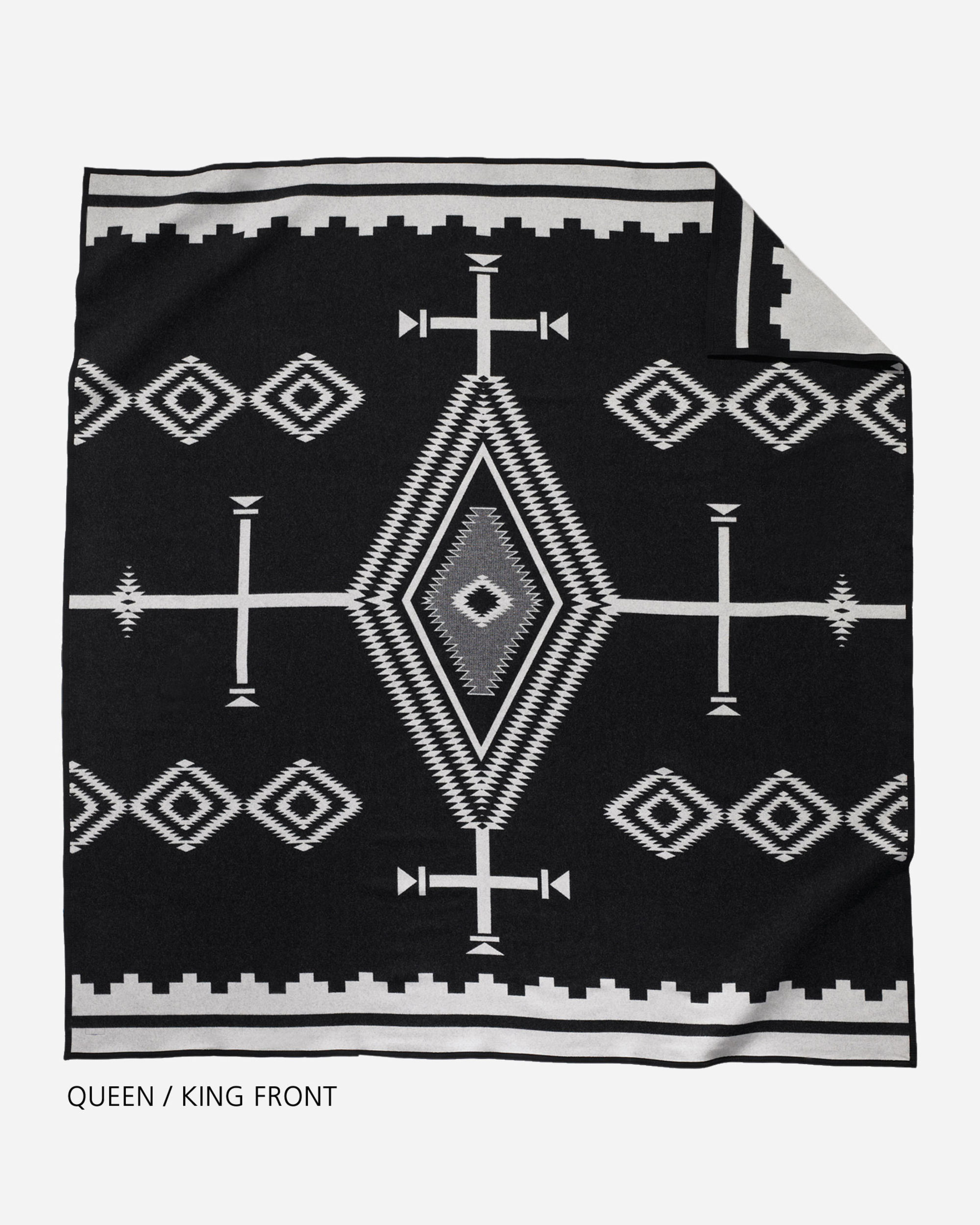 Spanish crosses, diamond-shaped "eyes" (ojos) and the symbols of the Navajo Four Mountains of Creation are dramatic in any setting. The design reverses from black background to white–an achievement possible only in mills as technologically advanced as ours.
