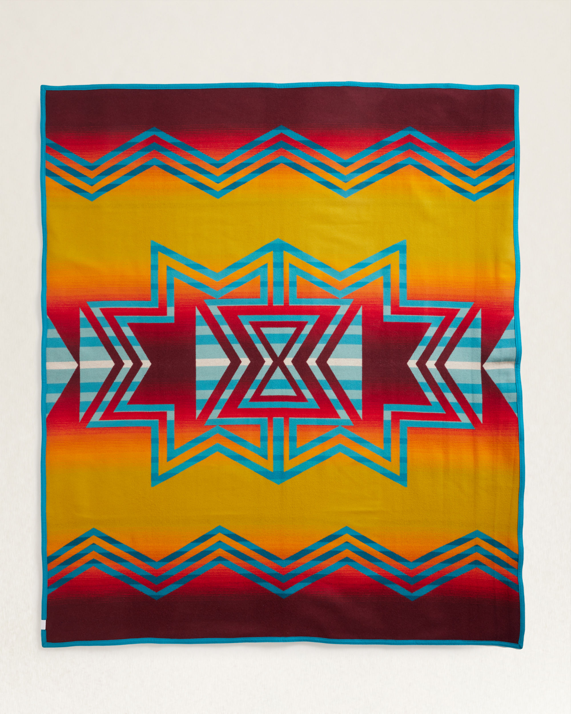 This blanket's design pays tribute to the Indigenous person representing more than one tribe. An hourglass shape evokes the matriarchal society of the Navajo, a serape layout honors the Yaqui, and turquoise symbolizes the Pueblo of Laguna��the Many Nations of the artist, Dustin Lopez. Woven from pure virgin wool in our Pendleton, Oregon, mill.