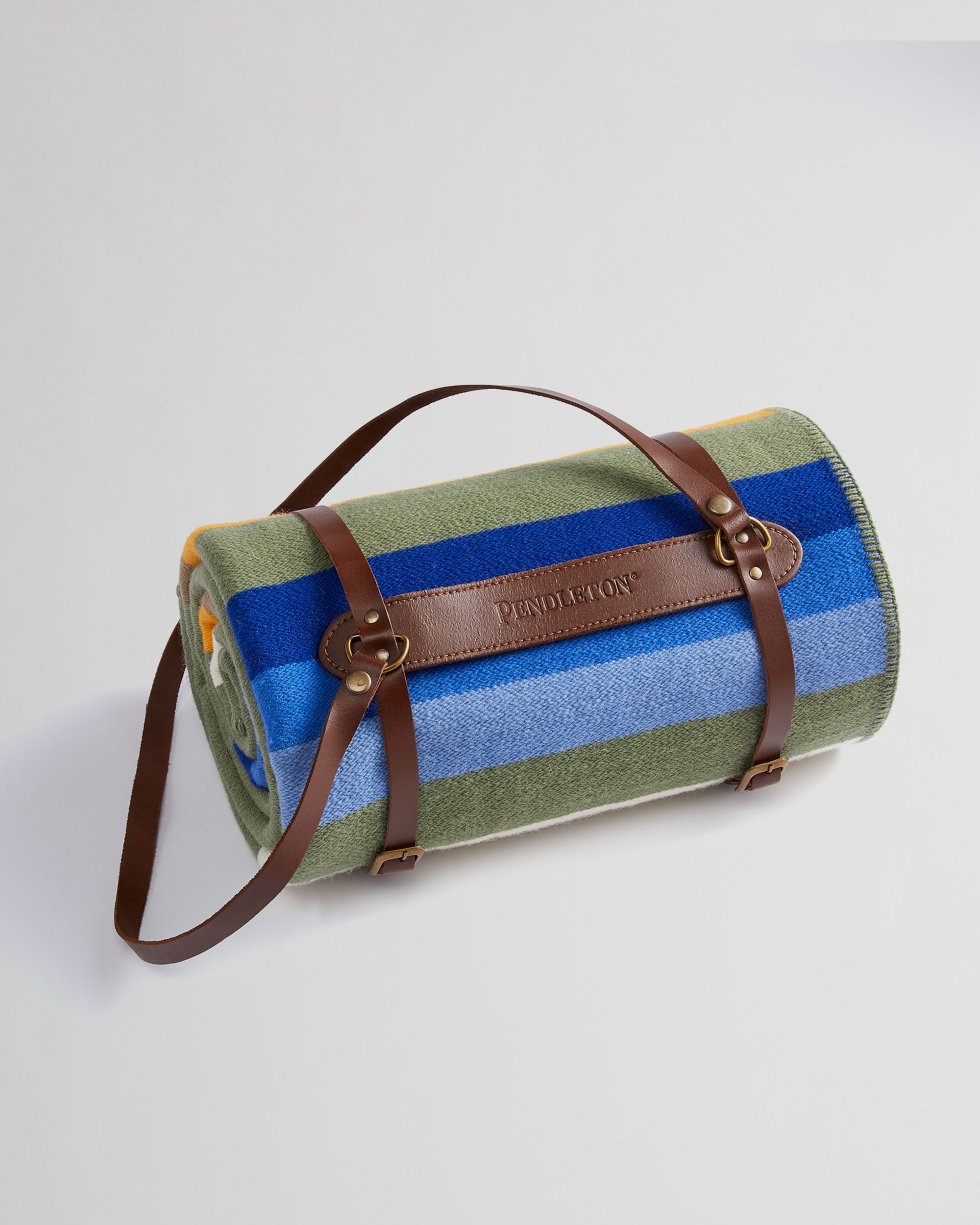A smaller version of our Rocky Mountain National Park Blanket, perfectly sized for the back of a couch or foot of bed. This wool throw is also a welcome companion for road trips, picnics and outdoor concerts. Includes leather carrier for easy portability.