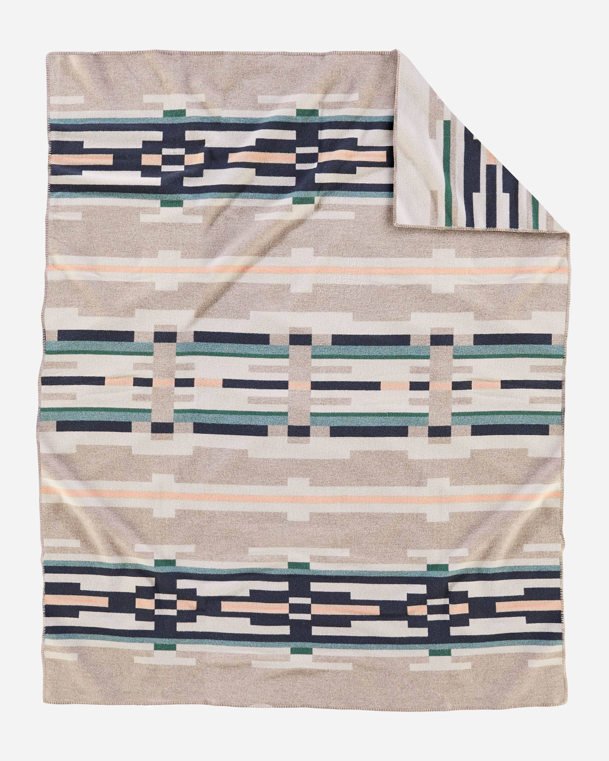 Horizontal bands of soft color echo the waving grasses, shallow ponds and gentle undulations of the Nebraska Sandhills, an "ocean of grass" that is the largest plant-anchored sand dune region in the United States. This wool blanket is dyed, woven and hand-finished in our Pacific Northwest mills, for quality you can count on.