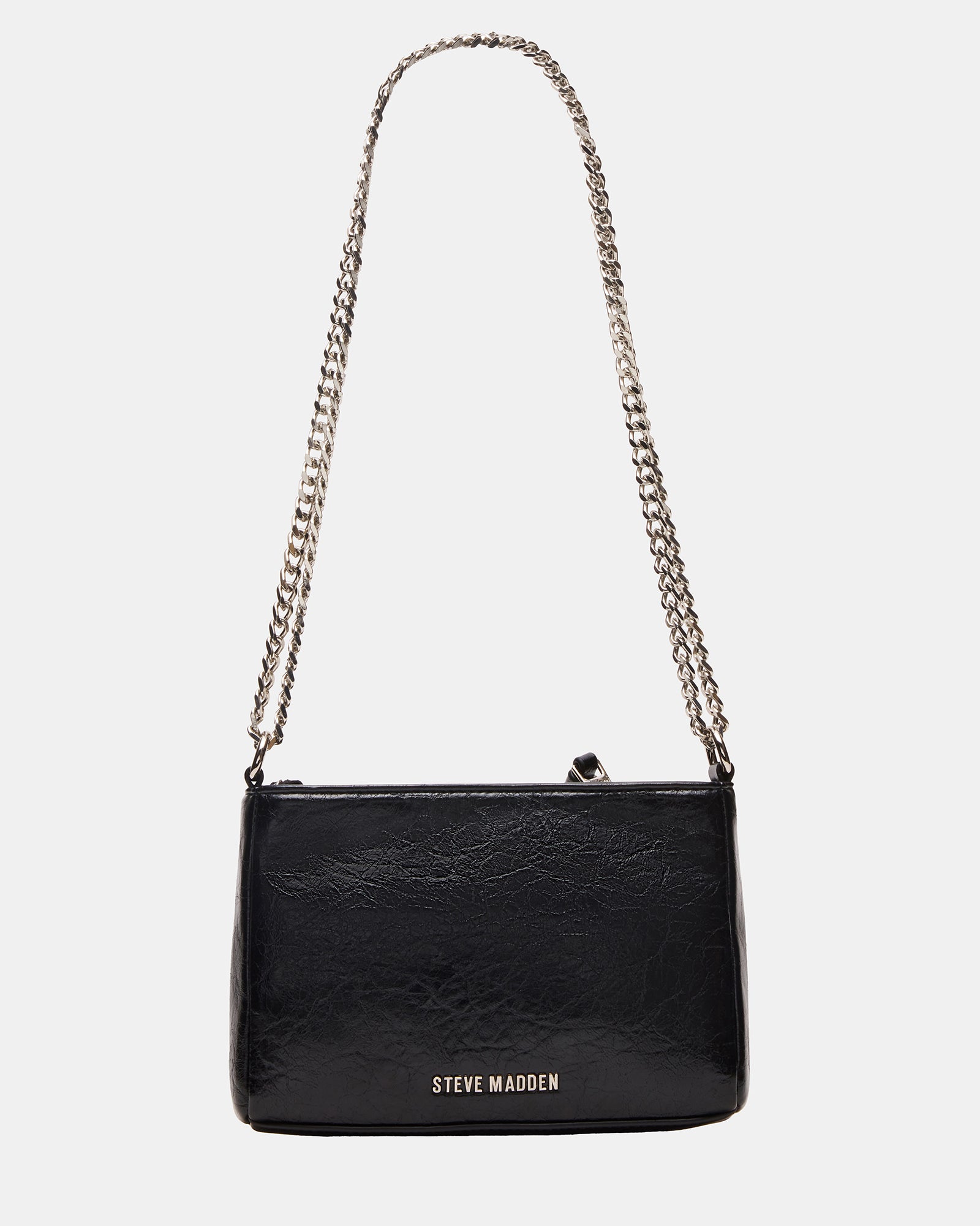 This mini SKY BAG BLACK/SILVER is a moto-inspired crossbody bag that combines edgy design with refined details. Featuring a sleek black body adorned with sparkling rhinestone studs, it adds a touch of glamour to any outfit. The chain strap offers both durability and a sophisticated contrast, making it an ideal accessory for hands-free convenience without compromising style. Perfect for carrying essentials with a modern, fashion-forward edge.