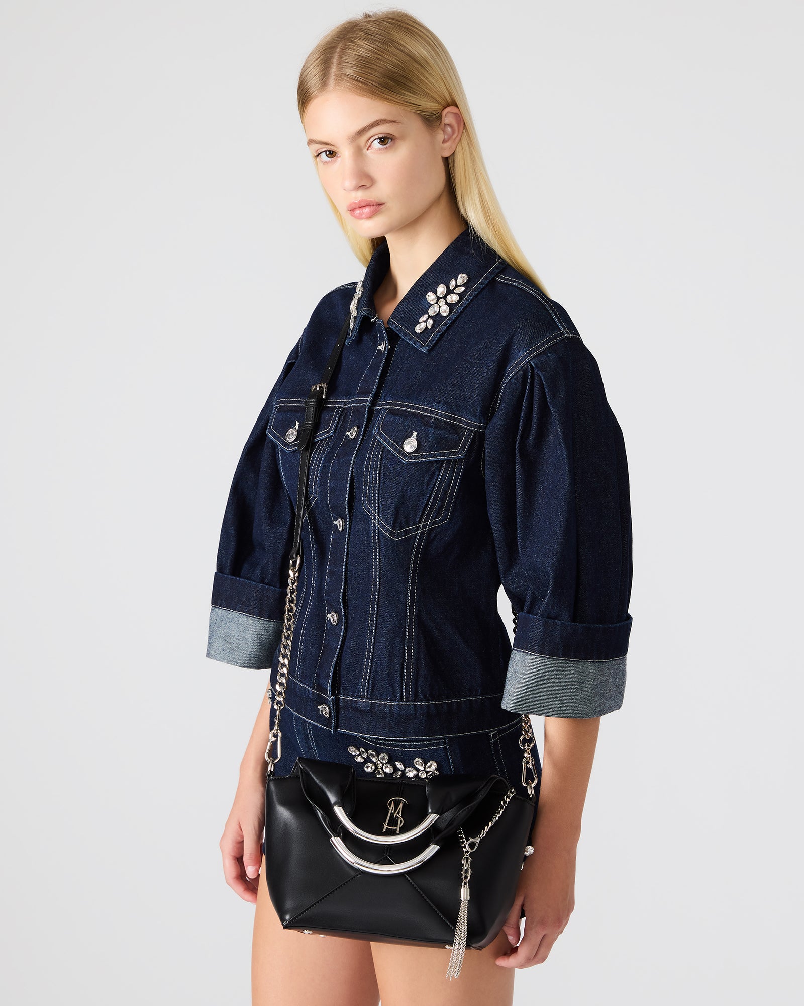 The VIV BAG BLACK/SILVER offers versatile style with its top-handle design and detachable, adjustable crossbody strap for hands-free convenience. Featuring unique hardware handles and statement hardware details, it adds sophistication. Detachable bag and tassel charms enhance its refined look, allowing for customization to match your personal style. Perfectly blending practicality with distinctive design, this bag is an expert choice for those seeking both function and flair.