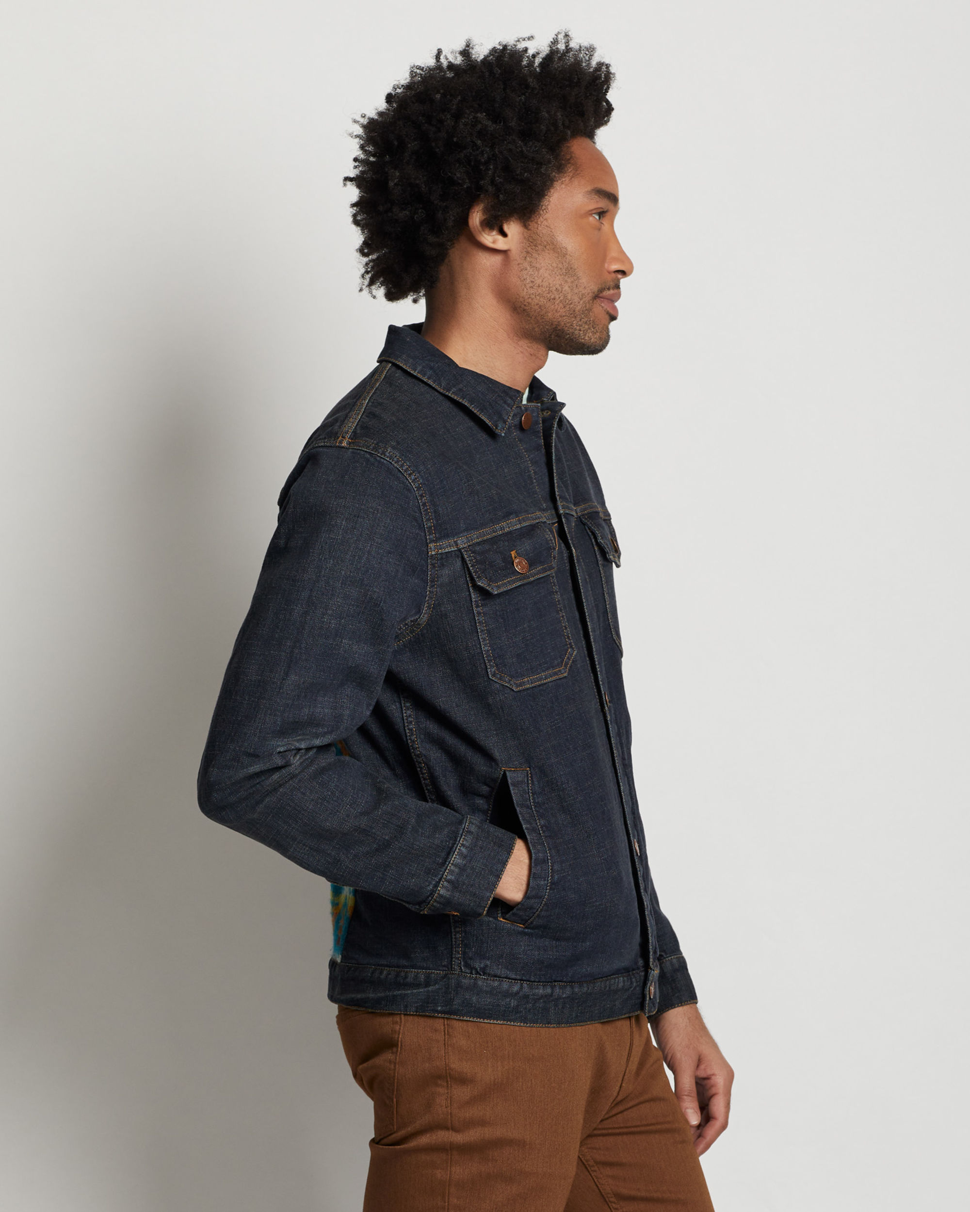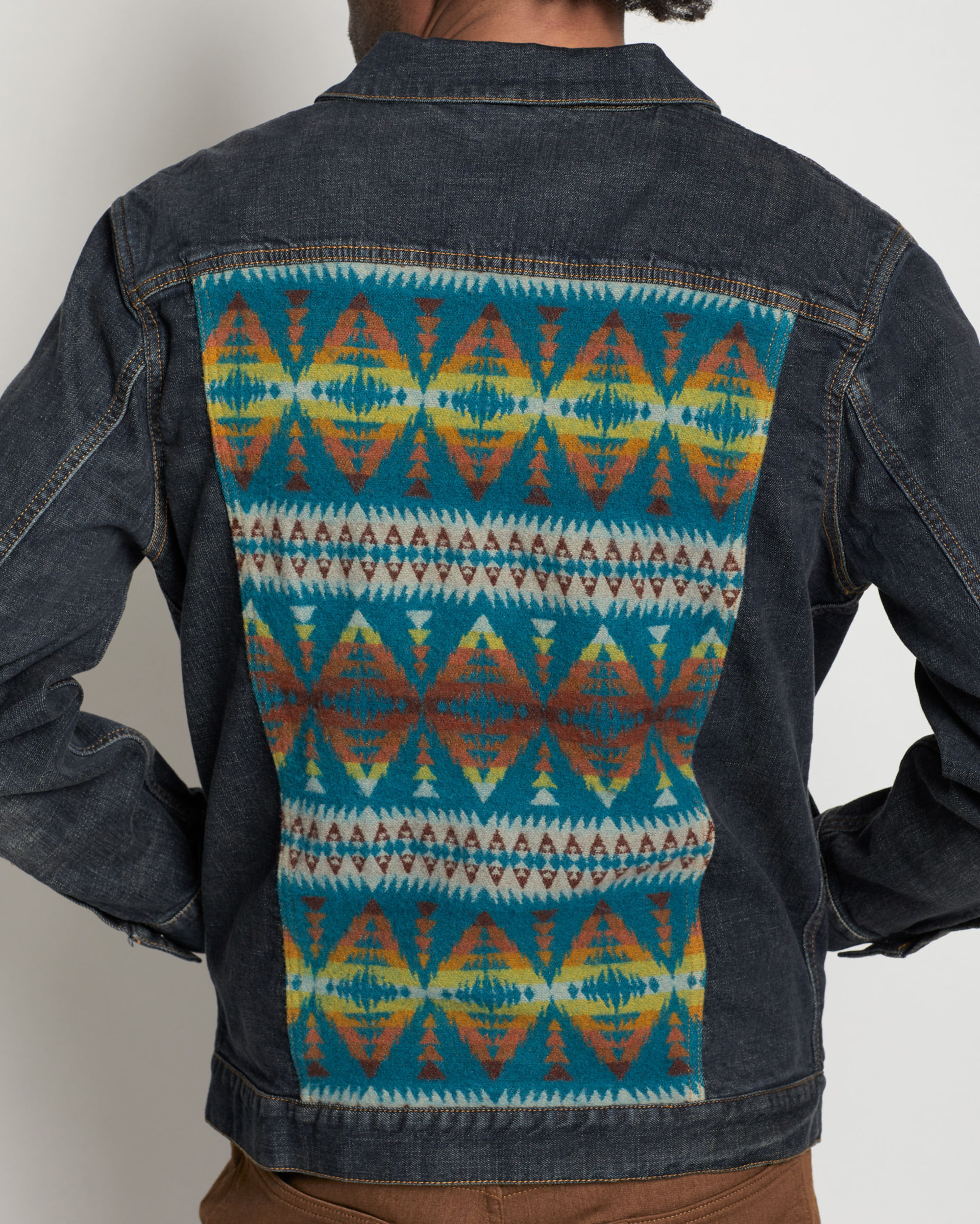 A classic denim jacket featuring a wool back piece displaying our popular Summit Peak pattern. Metal button-front closures and flap chest pockets.