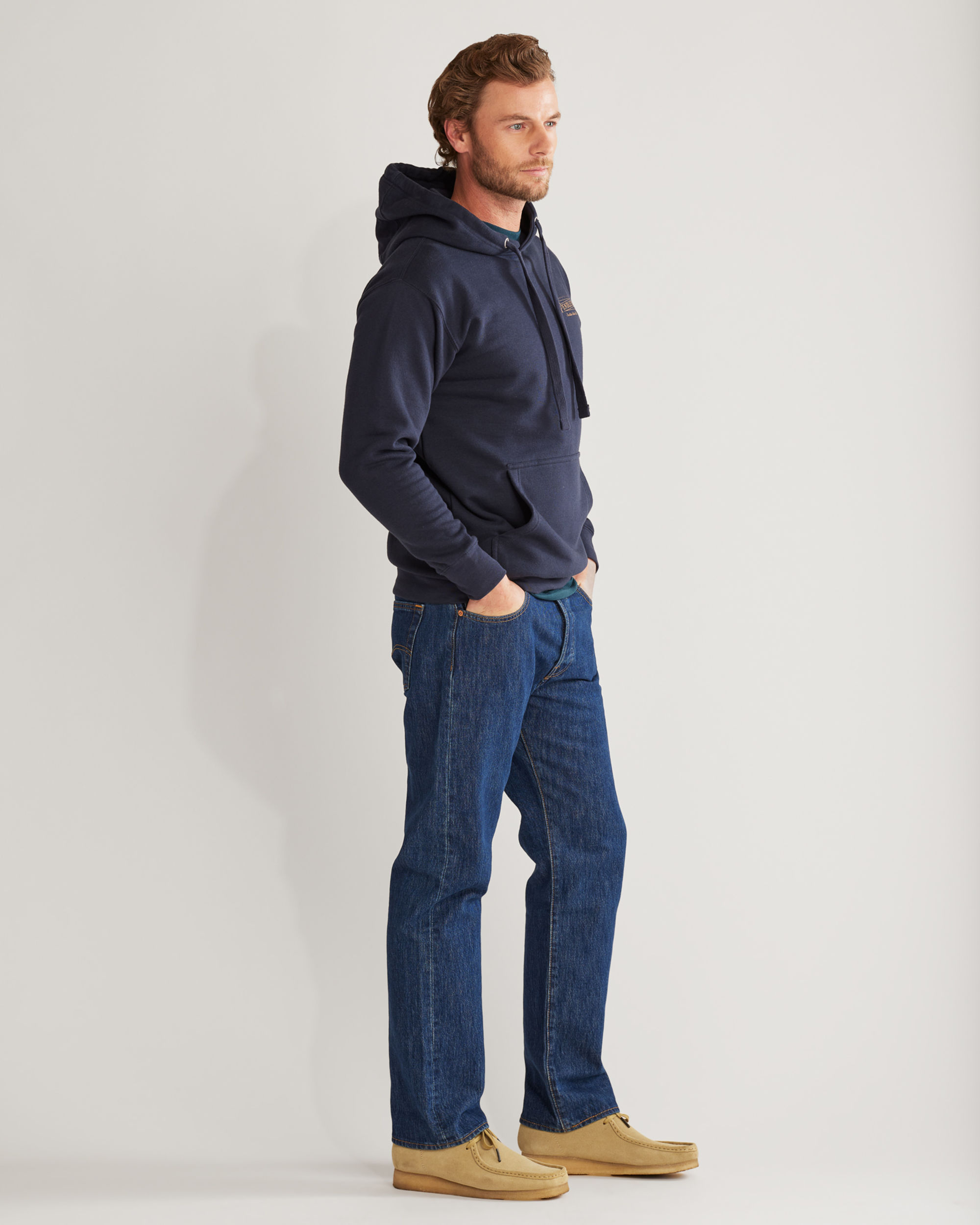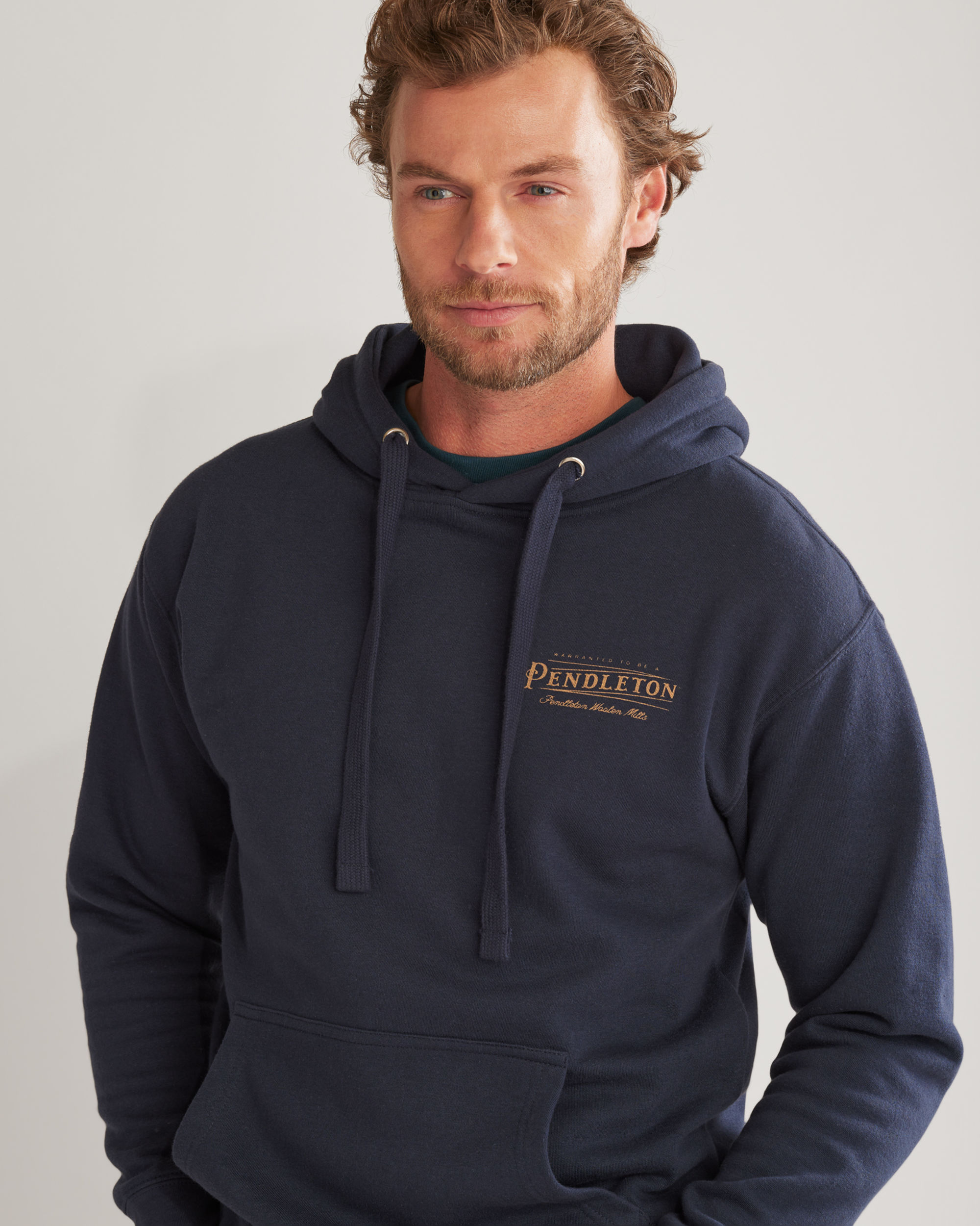 A classic pullover hoodie constructed from a cotton/polyester blend for comfort and shrink resistance. Features an oversized vintage Pendleton logo on back, with a small logo on front. Kangaroo pocket, drawstring hood.