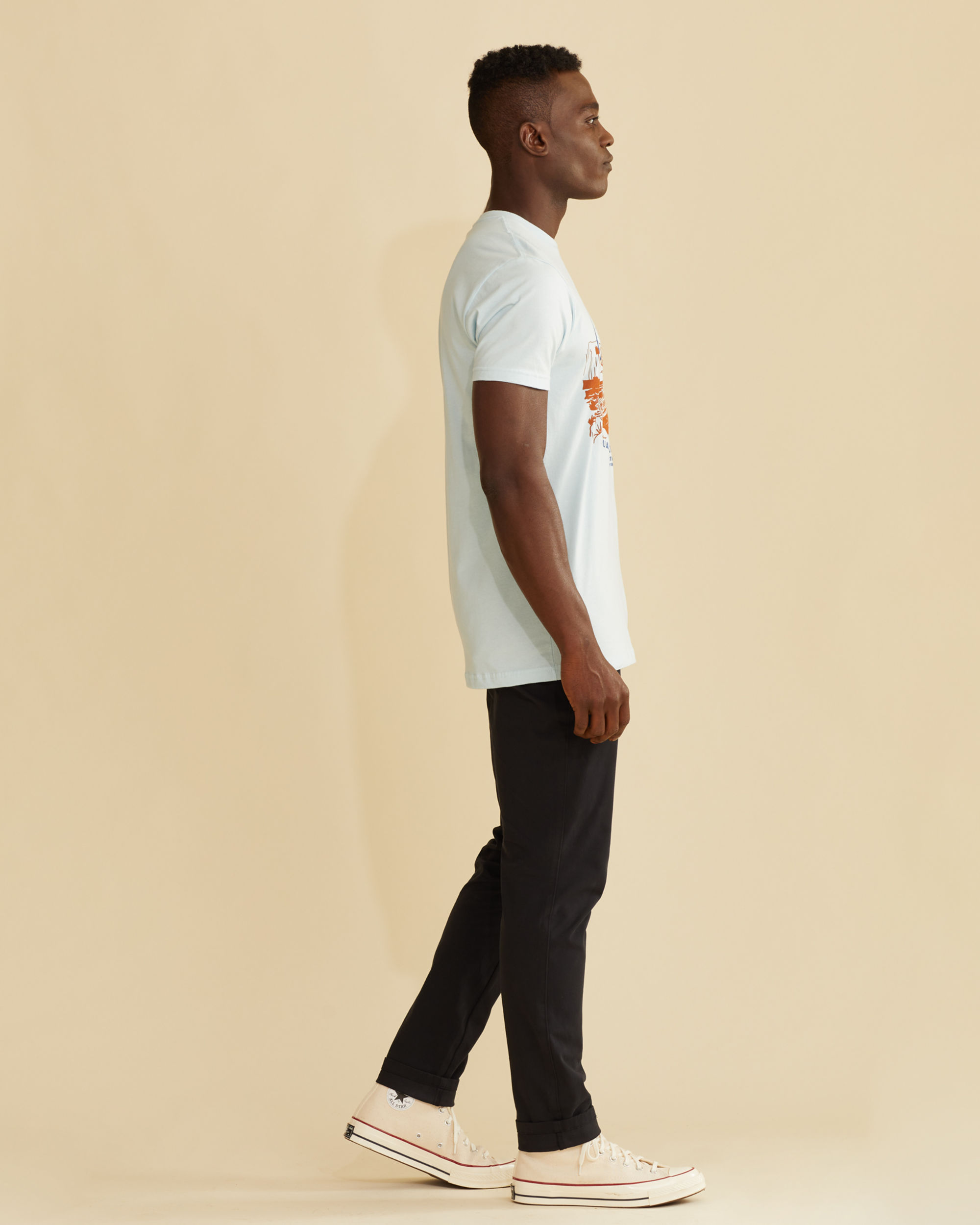 A retro-inspired scene depicts exploring the great outdoors in a classic off-road four-wheel drive rig. Pure combed cotton, small logo on front.