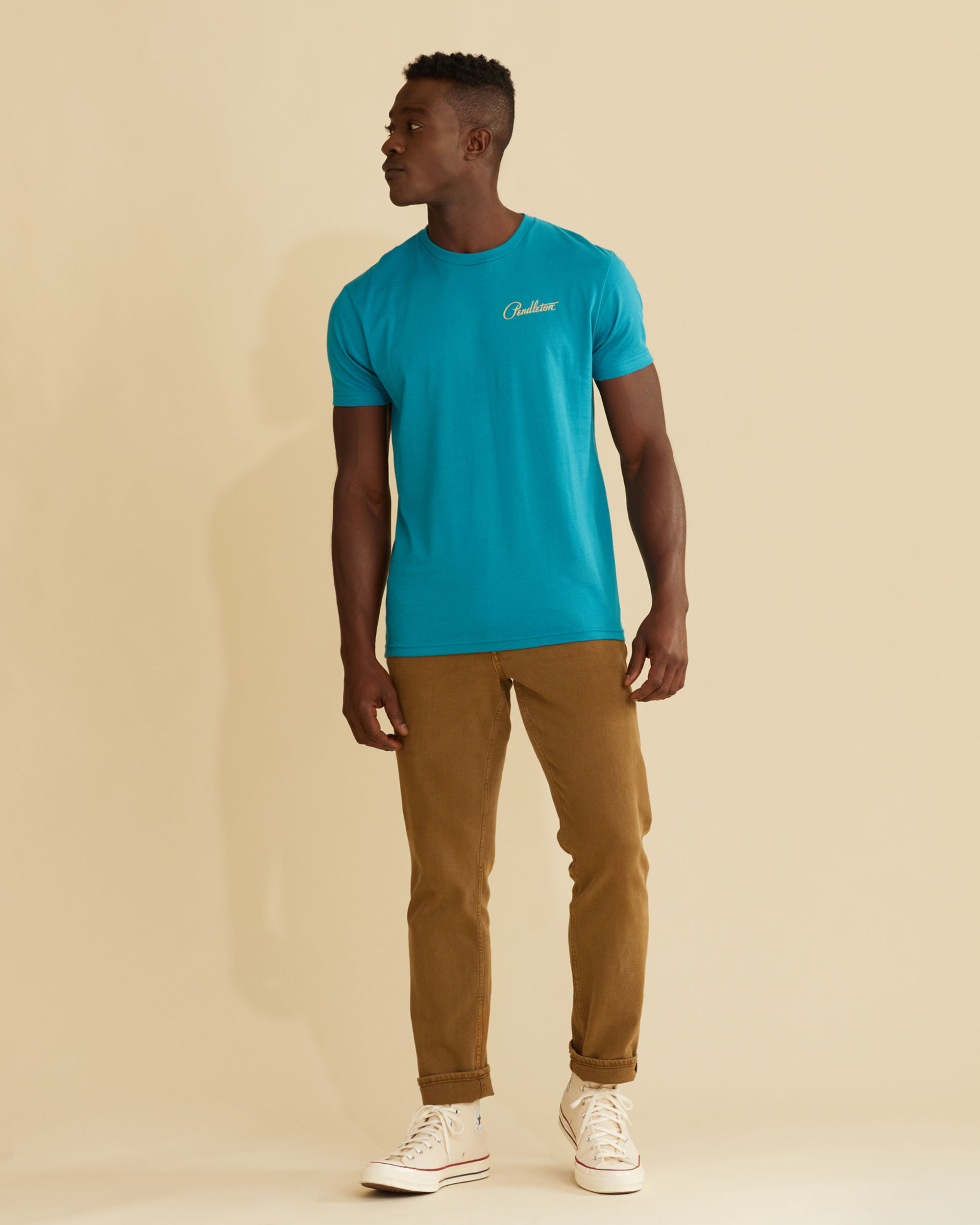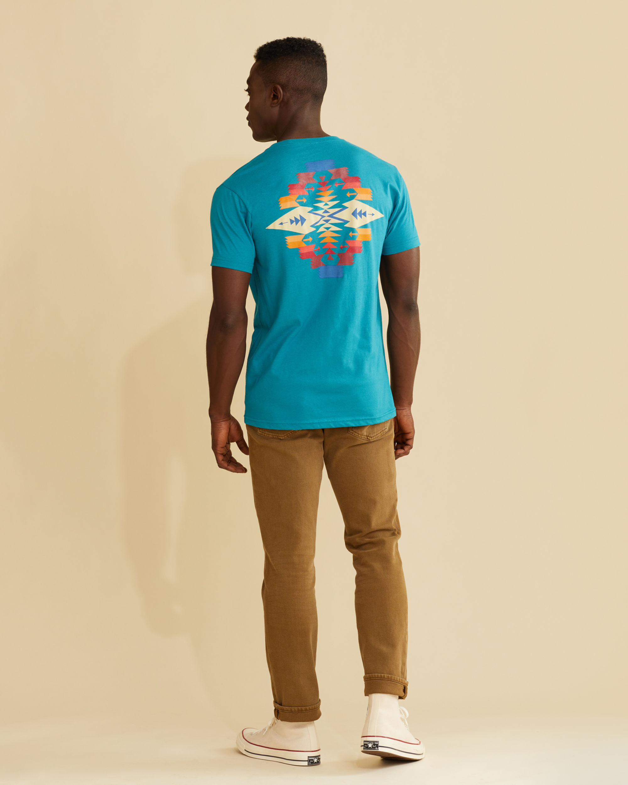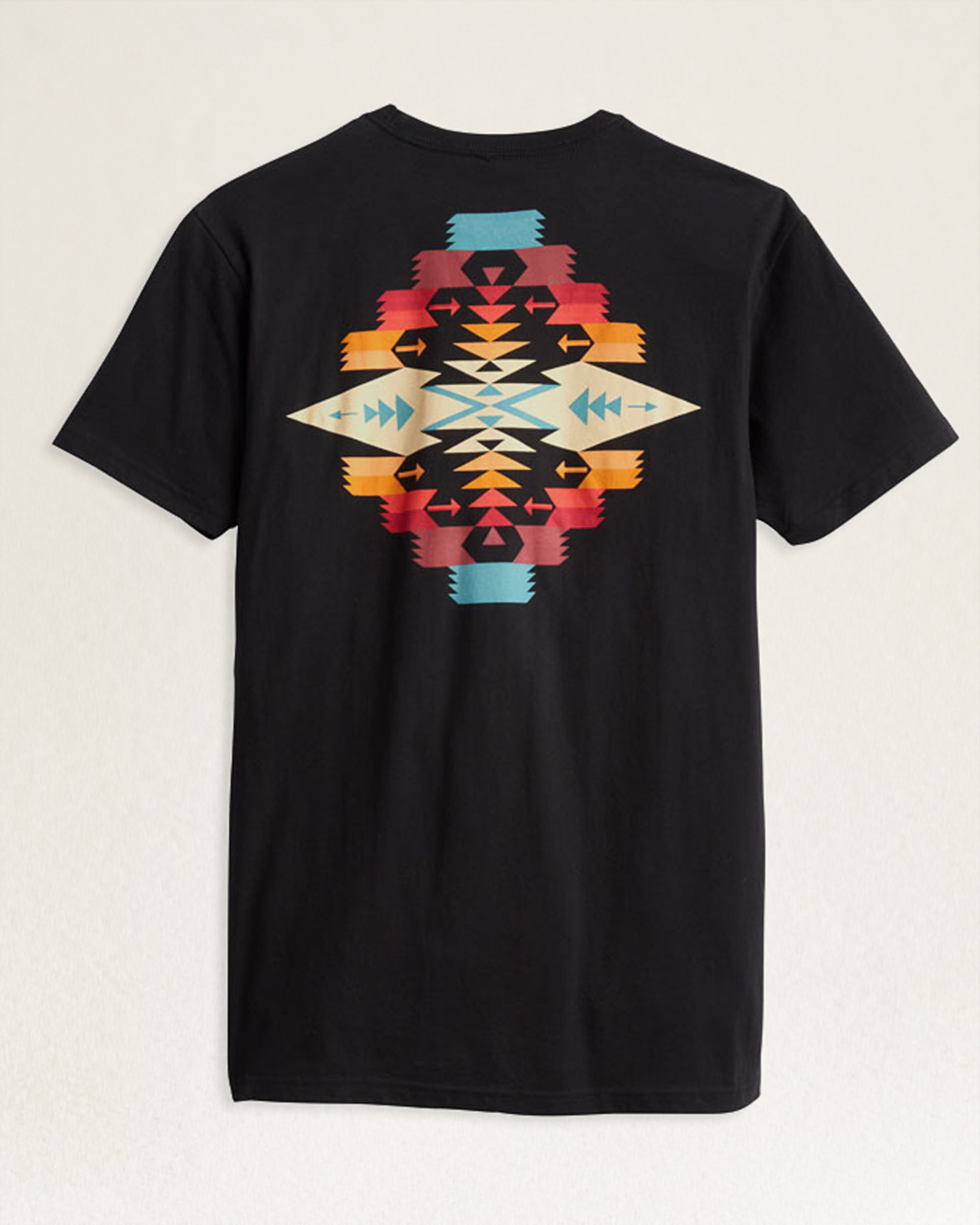 An exclusive geometric motif is featured on the back of this men’s crewneck tee, with a small Pendleton logo on the front left chest. Made of combed cotton that’s even softer and more durable than regular cotton. Short sleeves.