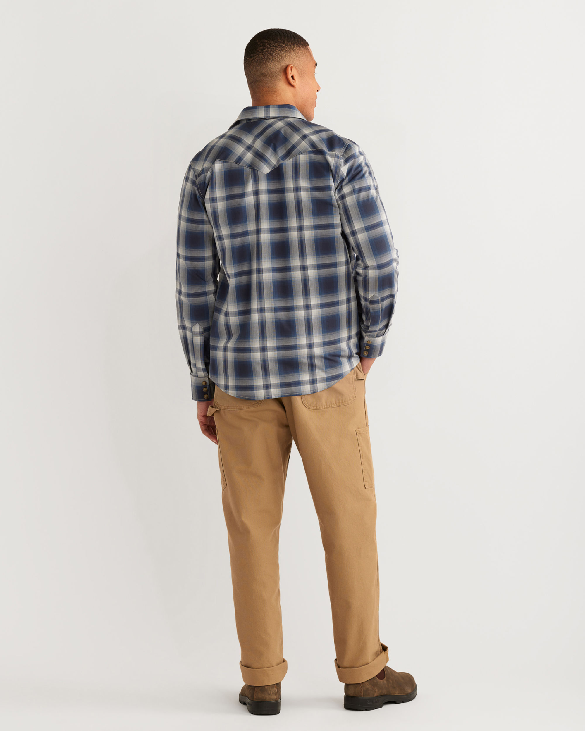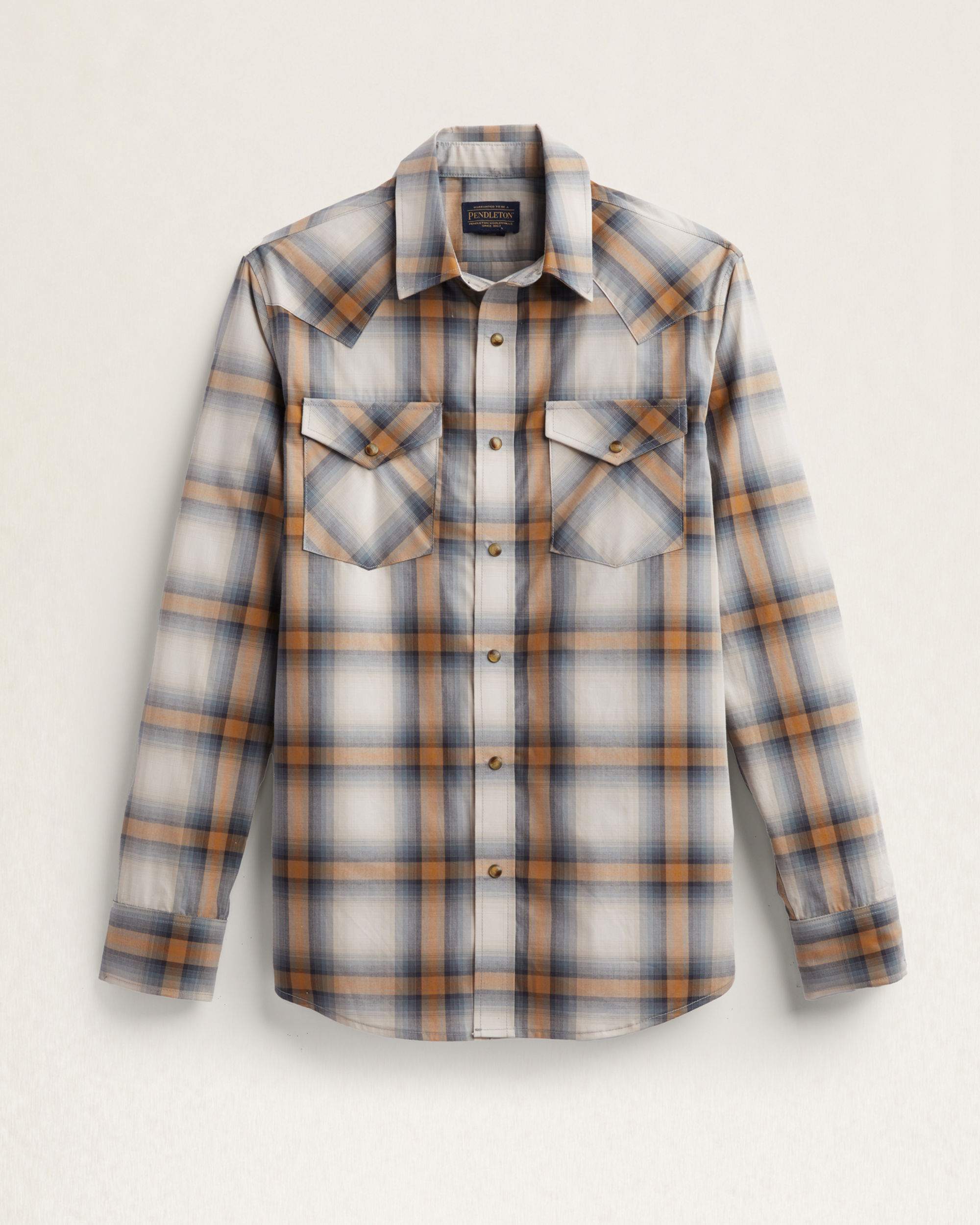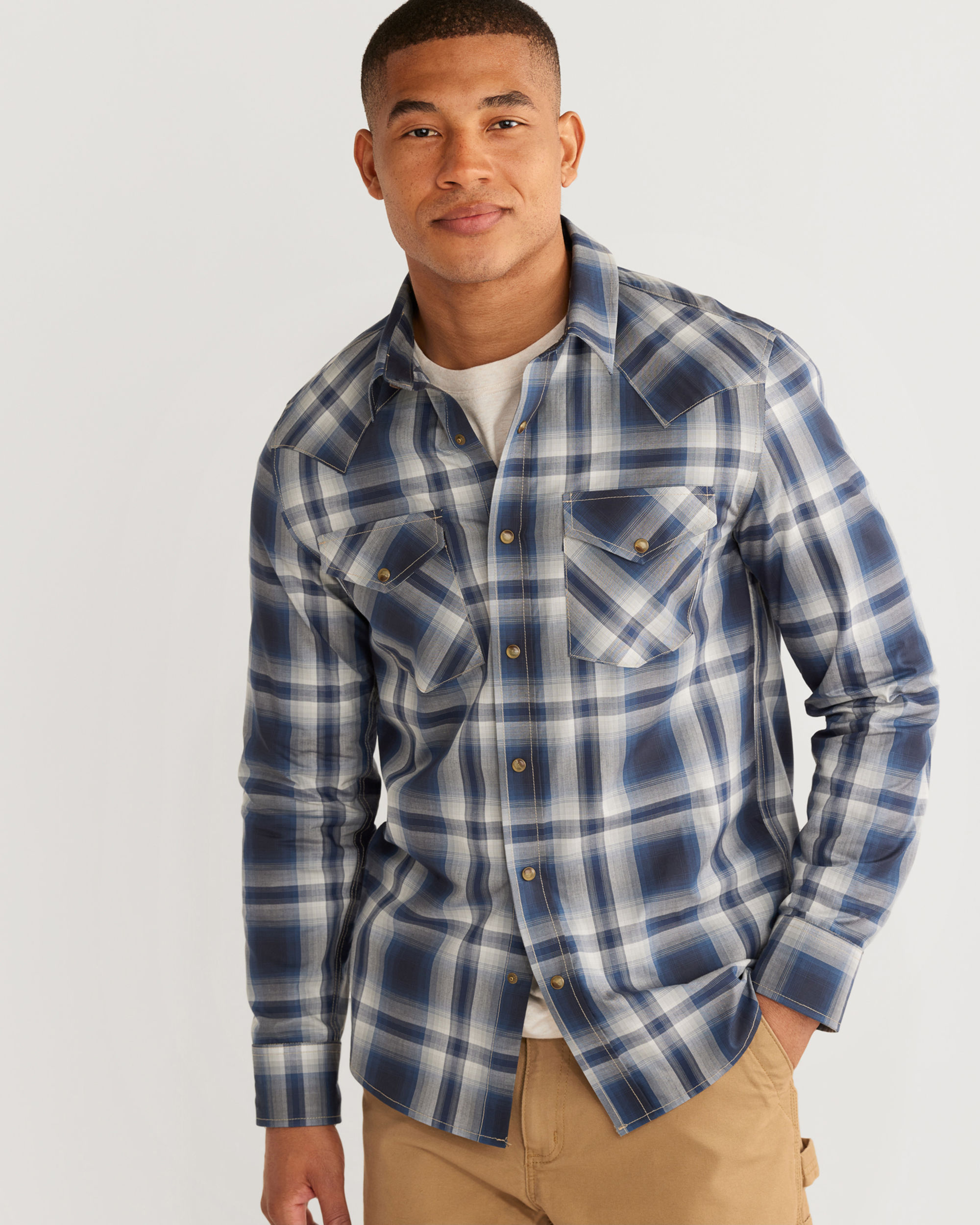 Our bestselling Frontier style men's pima cotton long-sleeve shirt featuring a spread collar, bias-cut yokes, front pockets, shirttail hem and premium snap buttons.