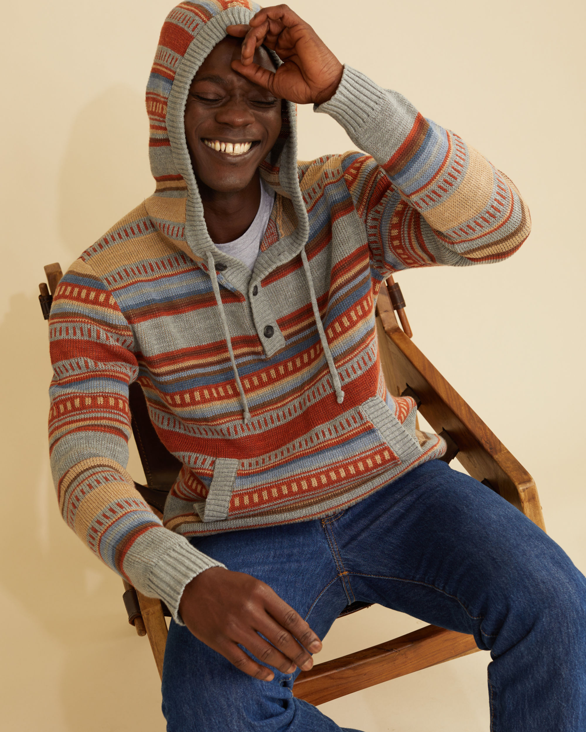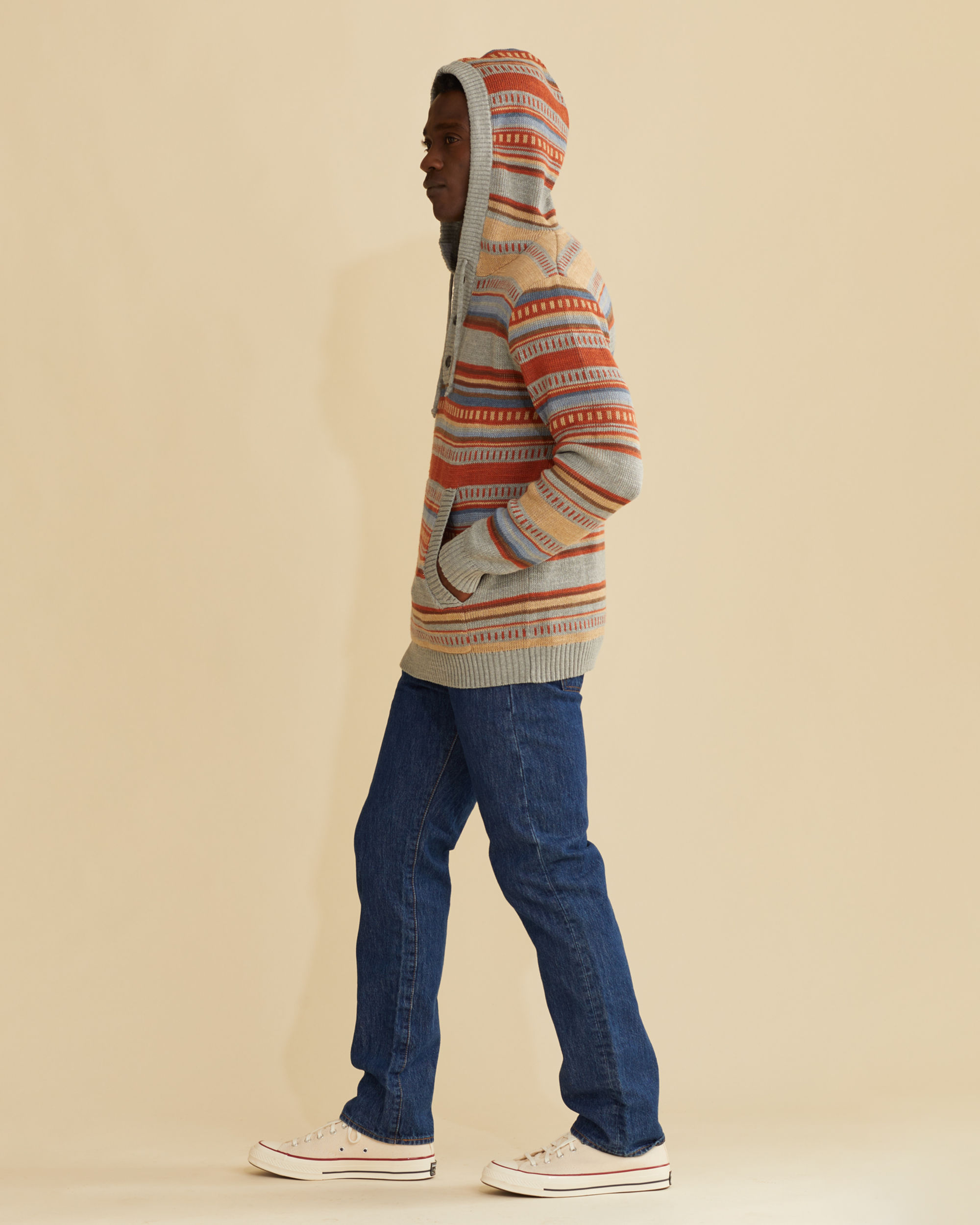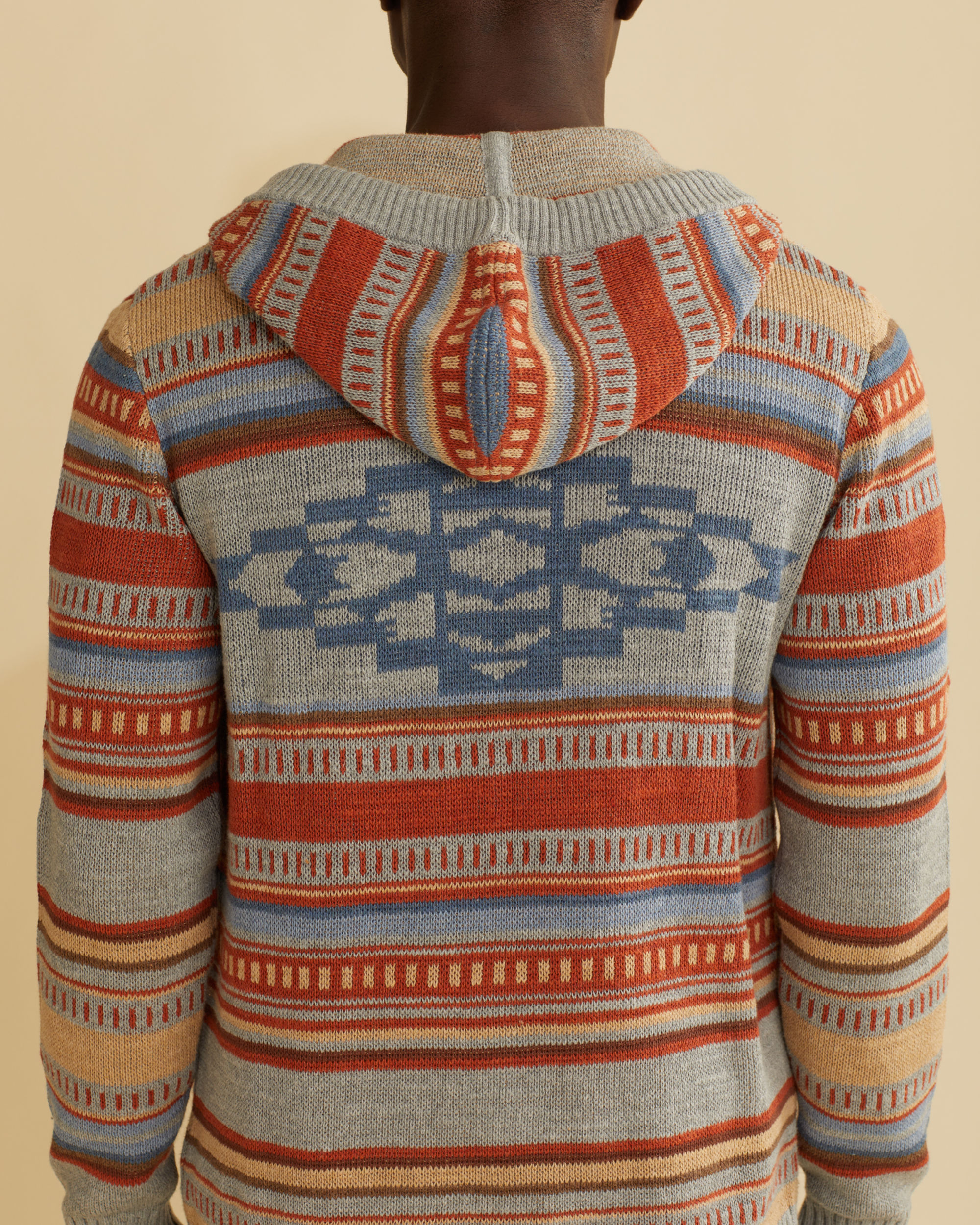 Hoodie styling with sweater comfort featuring serape-inspired stripes with a medallion on back, all in a textured cotton knit. Pullover with ribbed trim, faux horn buttons and kangaroo pockets.