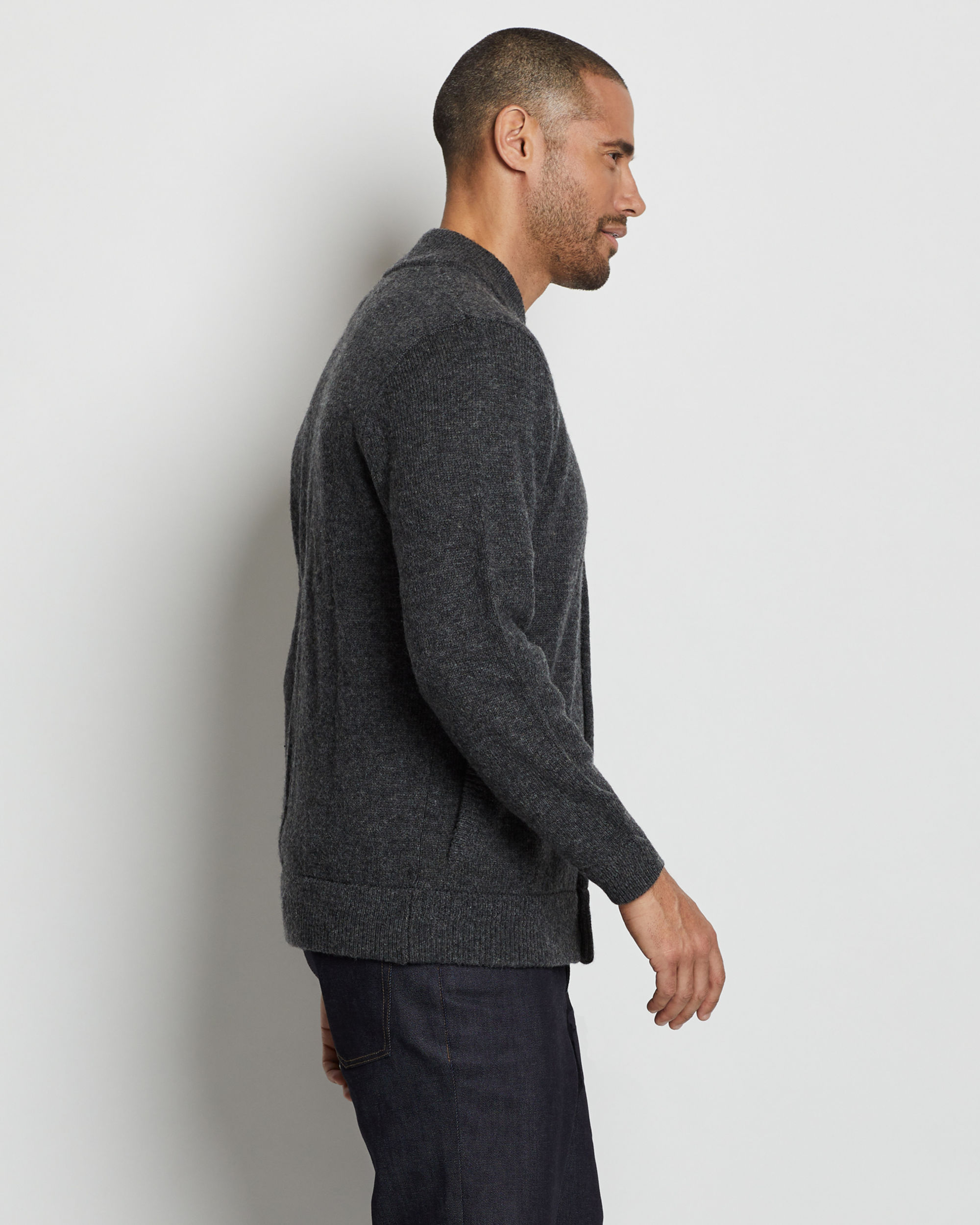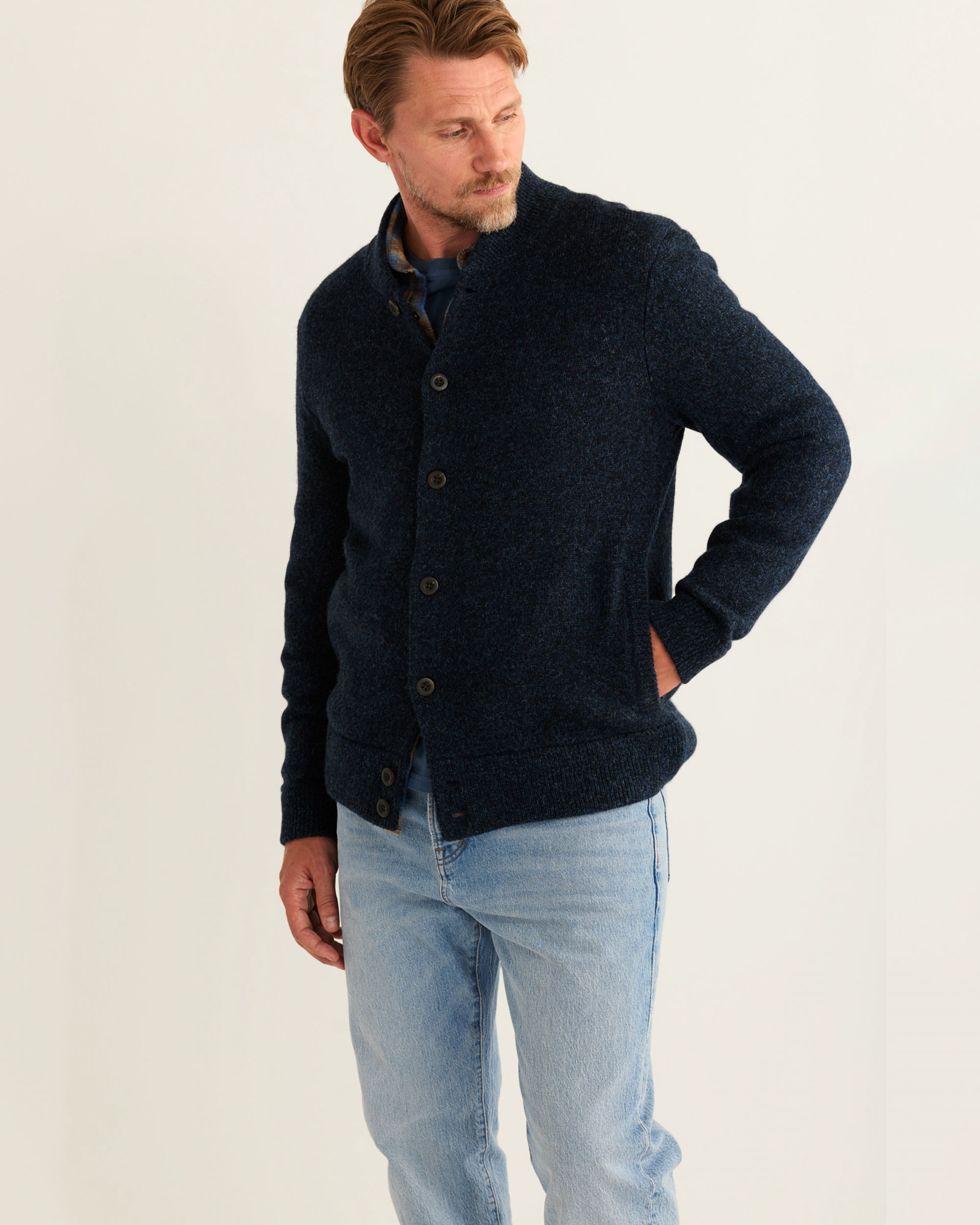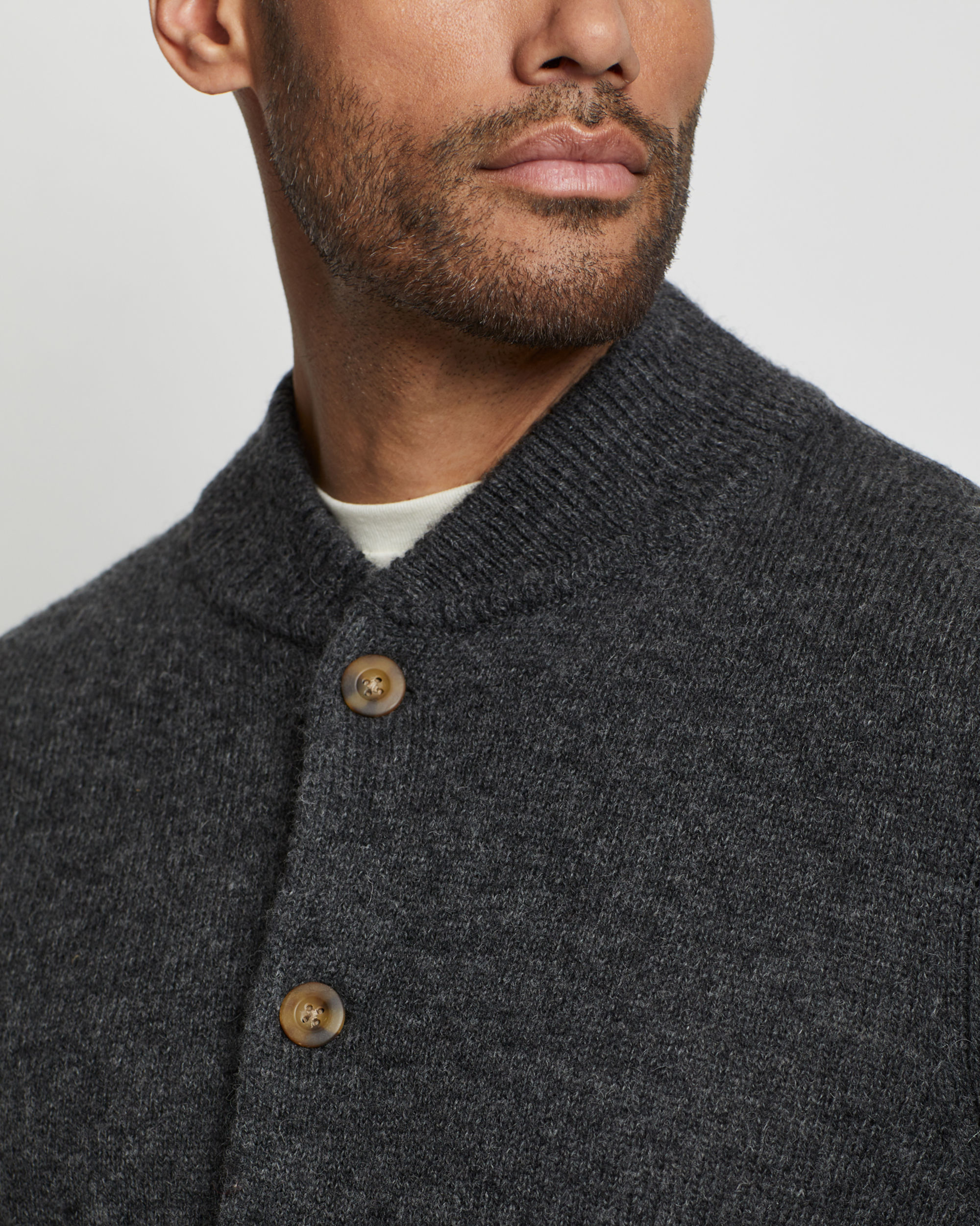 Men's bomber-inspired cardigan sweater in a thick ribbed stitch with a button front and two side-seam pockets. Knit from naturally water-resistant wool sourced from New Zealand. Machine washable, too!