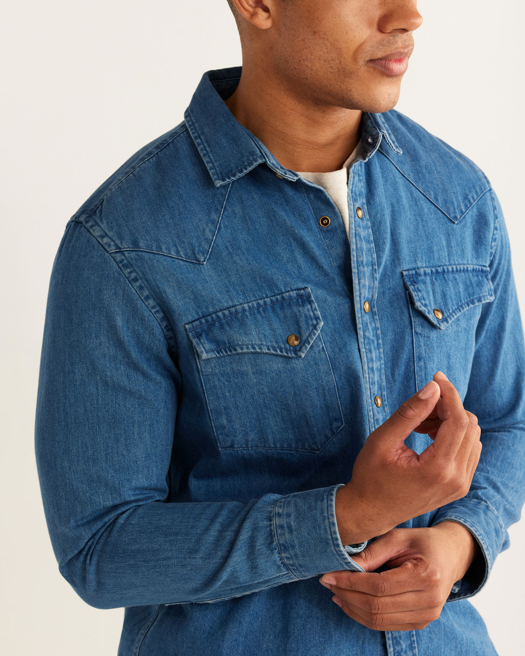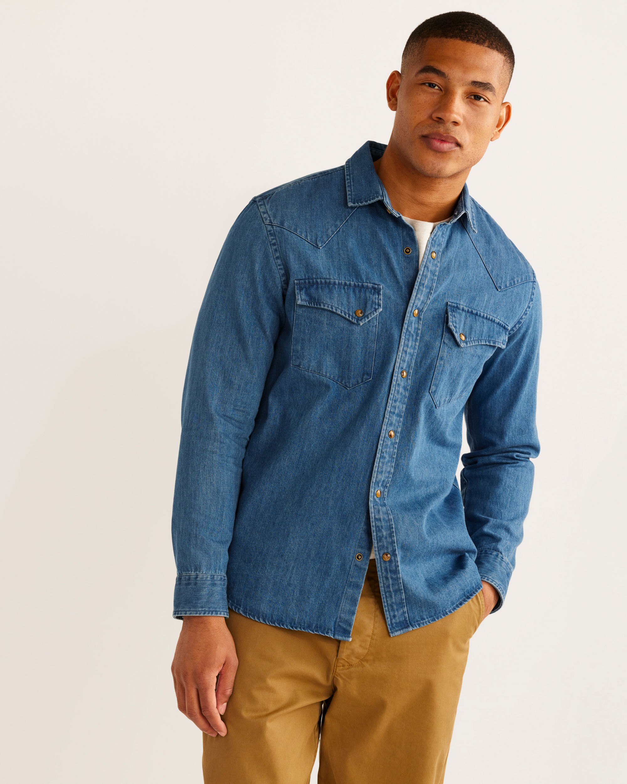 Inspired by our vintage Gambler button-down, this piece of iconic Westernwear features classic snap closures and distinct peaked front and back bias-cut yoke details. Woven from machine-washable cotton denim. Angled bias pockets, shirttail hem.