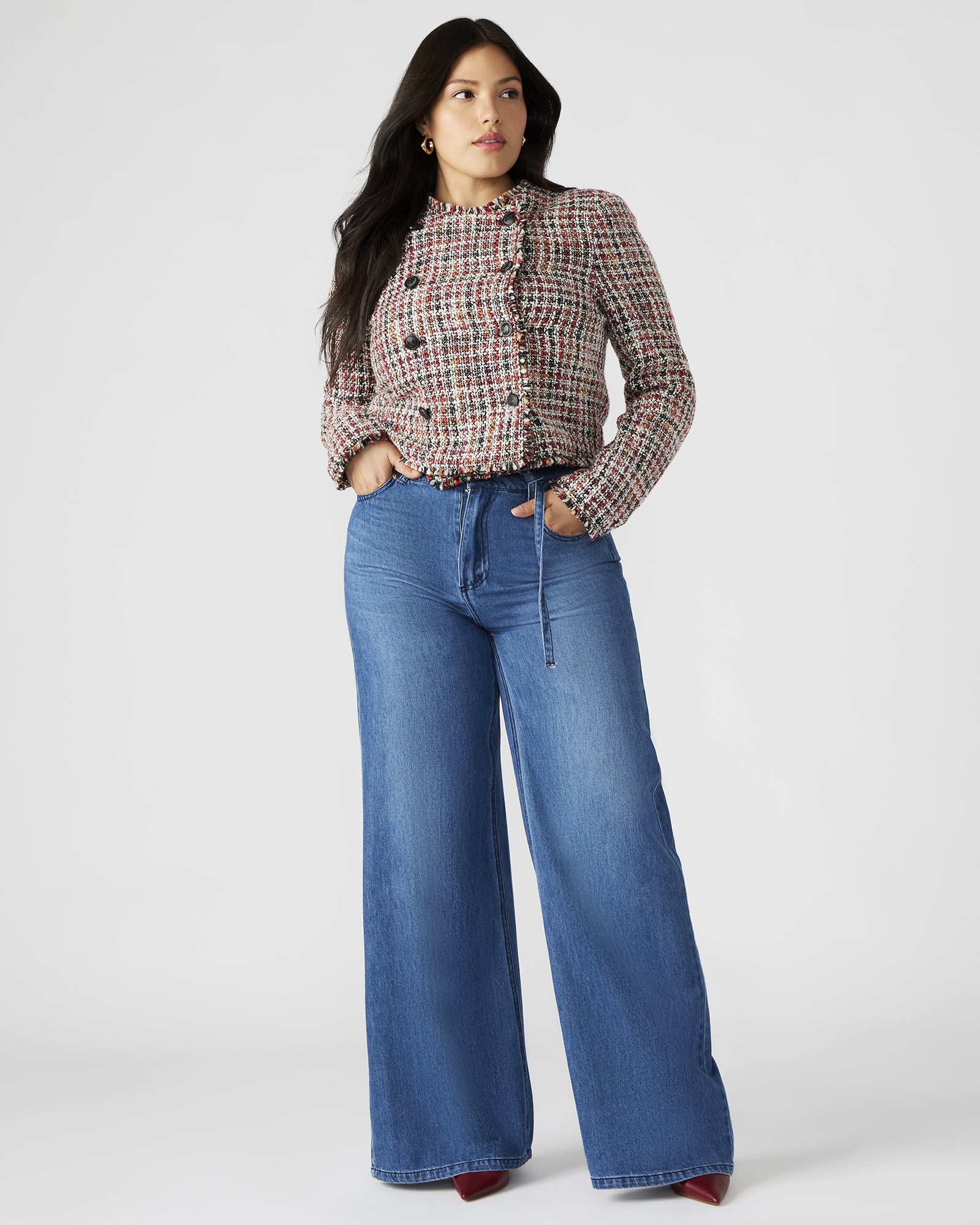 Introducing the ANTOINETTE - a stylish collarless tweed blazer that exudes sophistication. The fray hem detail trim adds a touch of elegance, while the double-breasted design is adorned with an animal crest button for a unique touch. With shoulder pads and a fully lined interior, this jacket looks great and provides a comfortable fit. Elevate your wardrobe with this must-have piece.