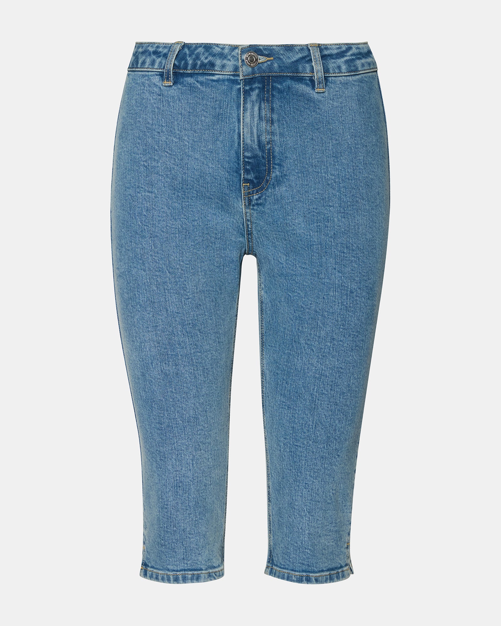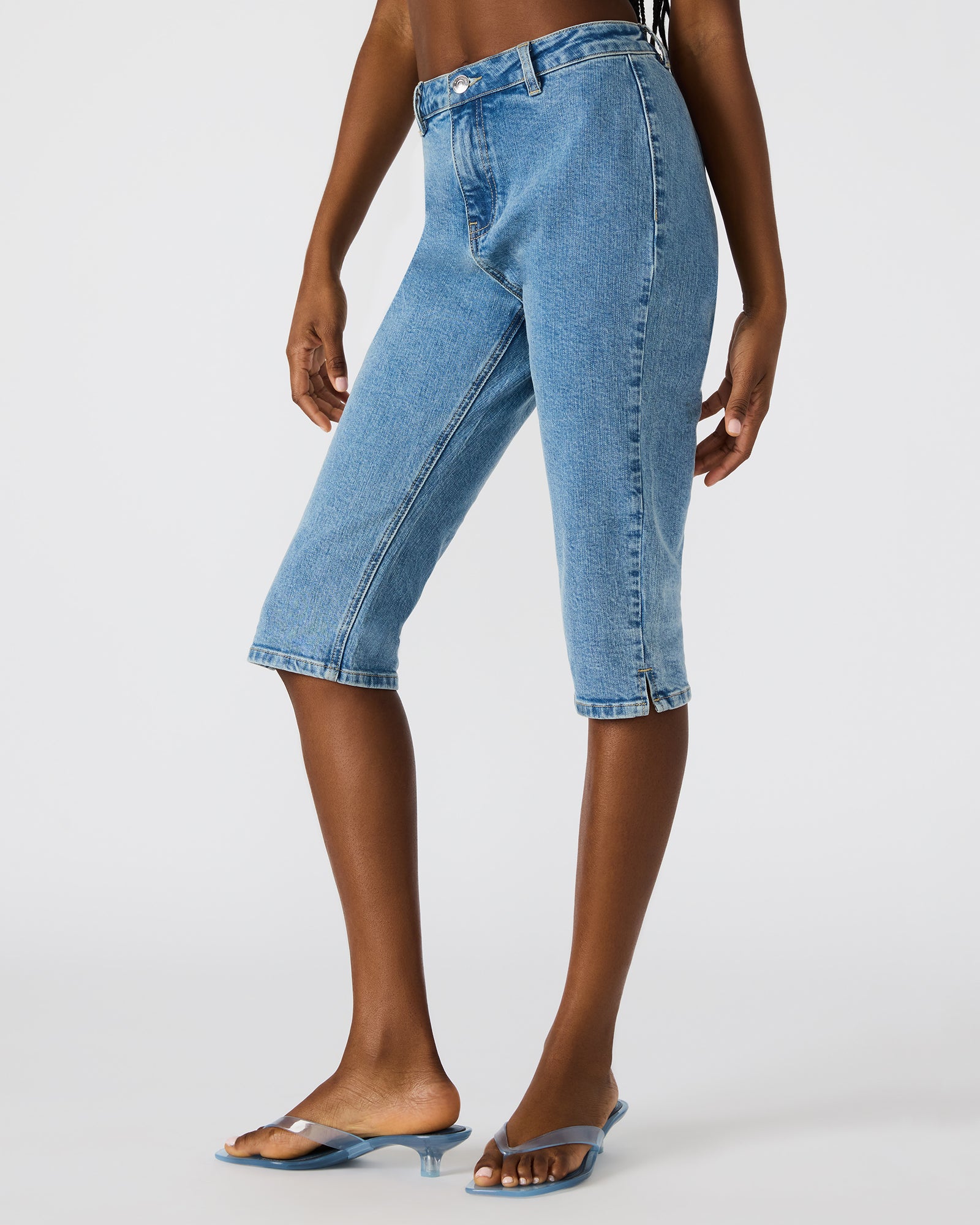 The SKINNY RINA DENIM CAPRI is a must-have for any fashion-forward individual. Its skinny fit, zipper, and button closure, and matching set make it a versatile piece that can be dressed up or down.